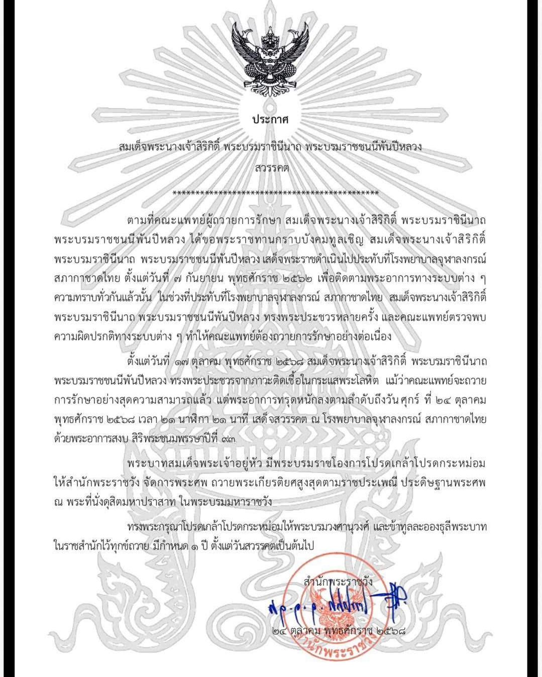 Bangkok, Thailand — The Bureau of the Royal Household has announced with deep sorrow the passing of Her Majesty Queen Sirikit, The Queen Mother, who passed away peacefully at 21:21 hours on Friday, 24 October 2025, at King Chulalongkorn Memorial Hospital, Thai Red Cross Society. Her Majesty was 93 years old.