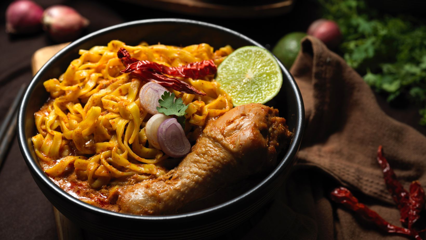 - Assembly: The curry broth and meat are poured over the boiled noodles, and the dish is topped with crispy noodles and garnishes.