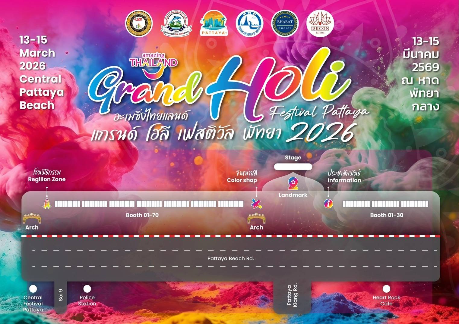 Scheduled for 13–15 March 2026, the festival will take over Central Pattaya Beach, turning the shoreline into a lively gathering space filled with music, dancing, and clouds of bright powder inspired by India’s iconic Holi tradition. Activities will take place daily from 3:00 PM to 7:00 PM, making it an ideal late-afternoon experience for both residents and visitors.